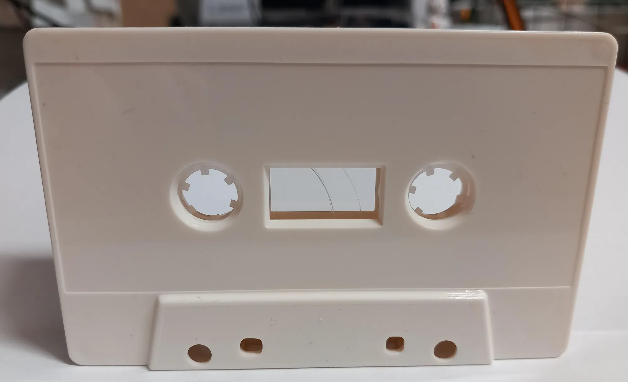 Cream/Ivory coloured cassette tapes. Welded shell, tab out (cover holes to enable record)